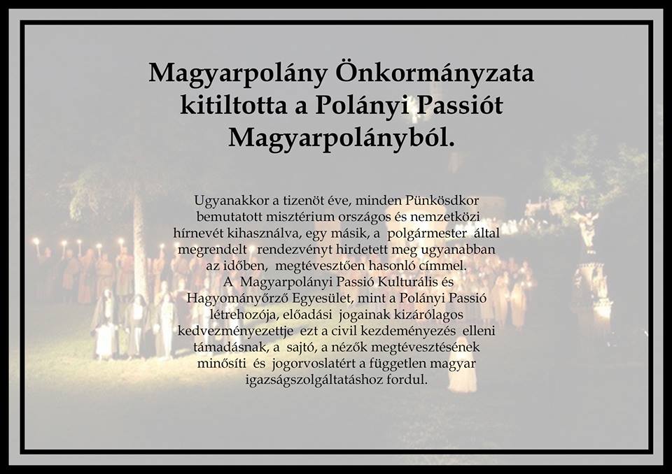 Nehezen hihető és még nehezebben érthető azok számára, akik az érte vívott groteszk harcot nem ismerik, hogy miért végezte ki a magyarpolányi önkormányzat azt a rendezvényt, amely a falunak mind a mai napig messze hangzó elismerést és hírnevet szerzett? Annál is inkább, hiszen a Polányi Passió egyben példaértékű történet is: Lakossági kezdeményezésből, hagyomány-teremtő szándékkal született, politikától független civil egyesület szervezésében, amely által már létrejöttének évében, 2001-ben, integrálódott az európai keresztény értékek ápolásának folyamatába. Közös áhítatként élték meg a részvevők, esztétikai élményként a nézők. Kiemelkedő magyar sikerként a régió, az ország és az Európai Passió-mozgalom. Életképes hagyománnyá vált, bekerült a megyei, felterjesztették felvételre a nemzeti értéktárba. Élt, virult háborítatlanul. Egészen 2011. április 20.-ig. Ekkor a Magyarpolányi Passió, Kulturális és Hagyományőrző Egyesület új elnököt választott: Sebe Istvánt a Polányi Passió kezdeményezőjét, létrehozóját, majd fáklyavivőjét, aki tizenkét éven keresztül Magyarpolány sikeres polgármestere volt. Az Egyesület elnökválasztási gyűlésén a regnáló új polgármester, Polt Rita is részt vett. Hívatlanul. Látszólag. Valóban előre eltervelt szándékkal, hogy befolyásolja az egyesületi választást, mint az alábbiakból kiderül: Az Önkormányzat 2011 áprilisában tartott testületi ülésén Polgármester asszony arról tudósítja a képviselőket, hogy az egyesületi választás „nem az előre megbeszéltek szerint törtét „ és a tagok 2/3 többséggel Sebe Istvánt választották meg, ami őt „ledöbbentette, mert mi a döntés értelme az egyértelmű provokáción kívül?” Hogy mitől minősül provokációnak egy független civil egyesület elnökválasztása a hatalom szemszögéből, mai napig megválaszolhatatlan. Ha csak nem fordítjuk meg a kérdést: Nem provokáció-e a hatalom részéről, hogy a független egyesület belügyeibe durván „előre megbeszéltek szerint!”, be akar avatkozni, hiszen a testületi ülésen az is elhangzott, hogy „ meg lehet-e változtatni a szavazást, és hogyan? Miután a jegyző felvilágosította a polgármester asszonyt, hogy a kétharmados többséggel megválasztott elnök nem mozdítható el, Polt Rita belátta, hogy „ezek szerint nincs értelme kezdeményezni az új elnökválasztást.” (Idézetek az Önkormányzat üléseinek jegyzőkönyvéből) És „ezek szerint”az a mai napig hangoztatott állítás is sántít, hogy az Egyesület elutasította az együttműködést az önkormányzattal. Hiszen azt éppen az új elnök kezdeményezte, nyomban megválasztása után, Polt Ritának címzett levelében: Tisztelt Polgármester Asszony! A Magyarpolányi Passió Kulturális és Hagyományőrző Egyesület 2011 április 20.-án megtartott közgyűlésén Ön tájékoztatást adott a képviselő Testület Passióval kapcsolatos szándékairól és egyben az önkormányzat és az Egyesület közötti együttműködés lehetőségét ajánlotta fel a Passió hosszú távú fenntarthatósága érdekében. A közgyűlés egyhangúan úgy döntött, hogy az Önkormányzat és az Egyesület által közösen kidolgozott együttműködési szerződésben rögzítettek alapján élni kíván a megtisztelő ajánlattal. Levelem a közös gondolkodás és munka szándékával, és egy személyes találkozás lehetőségének kérésével írom. A felajánlott személyes találkozás a polgármester asszony és az elnök között sem jött létre. Ám történt 2011. május 4.-én, Polt Rita kezdeményezésére egy másik, jelentős találkozó, amelyre Keresztes János színművészt(Jézus alakítóját), Szalóky B. Dániel rendező munkatársát valamint Tömöry Pétert a Polányi Passió íróját-rendezőjét invitálta konspiratív megbeszélésre a polgármester asszony egy veszprémi pizzeriában, ahol egyértelműen kijelentette, hogy amíg Sebe István az Egyesület elnöke nem lesz akadálytalan a közreműködés Hogy miért nem állt el, mépgis az egyesülettel való „együttműködéstől” a polgármester és testülete, arra a fenti beszélgetést követő testületi ülés (2011.május 9.) jegyzőkönyve világít rá: „ Az Önkormányzat sajnos kényszerhelyzetben van, mivel 2010 évben az Ora et labora – imádkozz és dolgozz! Avagy összefogással a helyi kulturális érdekek integrált bemutatásáért című projekt keretein belül elnyert támogatással az Önkormányzat vállalta, hogy a fény-és hangtechnikát, valamint nézőteret 5 évig üzemelteti, amelynek keretében meghatározott összegű jegybevételre tesz szert. A jegybevételeknek az Önkormányzat számláján át kell futniuk, így tehát kénytelen biztosítani a Polányi Passió megrendezését.” Innen kezdve cselekményesen bomlik ki a groteszk színjáték. S vált át kényszerházassággá: a sem veled sem nélküled mindközönséges bölcselete szerint. 2011. június 6.-án megszületik a kurens évre szóló együttműködési megállapodás, amelynek értelmében – bizonyos rá erőltetett kompromisszumok árán – az Egyesület eljátsztathatja a Polányi Passió tízéves, jubileumi előadásait a magyarpolányi Kálváriadombon, az uniós pályázaton elnyert fény-és hangtechnika valamint a nézőtér bérmentes felhasználásával. És elkezdődik az önkormányzat által máig hangoztatott „elszámolási problémák” felemlegetése, ami selyempapírba csomagoltan azt jelenti, hogy az Egyesület lop. Honnan, mit, mikor? Ha az Önkormányzatnak erre bizonyítékai vannak, miért nem fordul az igazságügyi szervekhez? Nem fordul. Csupán rágalmaz, hiszen nincs, nem lehet erre bizonyítható oka, hiszen a jegybevétel átfut az önkormányzat számláján, a költségveté